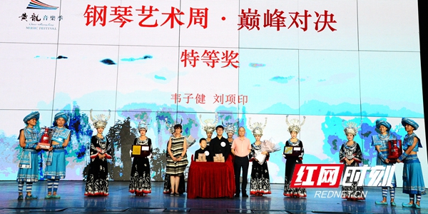 红网时刻8月10日讯(通讯员 吴勇兵 邓道理)今日上午,在世界自然遗产地张家界武陵源黄龙洞景区哈利路亚音乐厅,经过近三小时的巅峰对决,北京琴手韦子建、山东琴手刘项印分别获得钢琴艺术周专业组、业余组特等奖。黄龙音乐季创始人、组委会秘书长叶文智,肖邦国际钢琴大赛评委会主任、黄龙音乐季钢琴艺术周评委会名誉主任波波娃为两位“巅峰王者”分别颁发50万元、30万元的艺术发展基金以及奖杯,为2018黄龙音乐季钢琴艺术周画上圆满的句号。