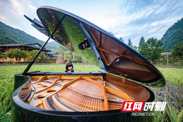 8月9日,一名网名“音乐神宝”的10岁小女孩在音乐稻田间弹奏起她自己创作的钢琴曲。