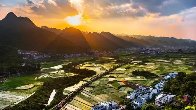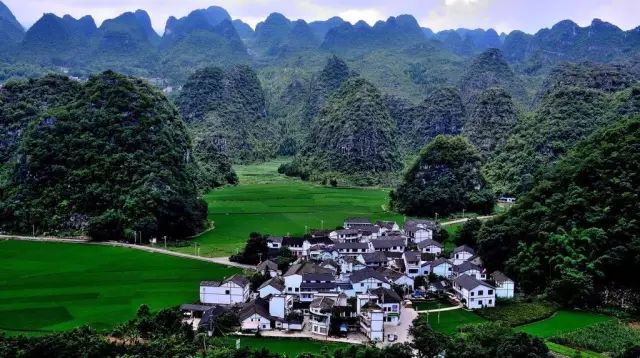 成千上万的馒头峰,错落分布着大片的稻田,间或在绿丛中装点一些灰瓦白房,是一张极好的风景明信片。