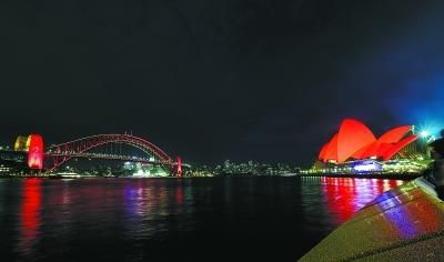 ▲2月4日,悉尼歌剧院和海港大桥同时点亮象征吉祥的红色照明,悉尼环形码头也点亮了代表十二生肖的花灯。 新华社记者 白雪飞摄