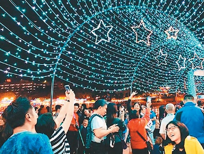 高雄爱河金银河灯会首创数座绚烂百米隧道灯,吸引民众拍照取景。柯宗纬摄