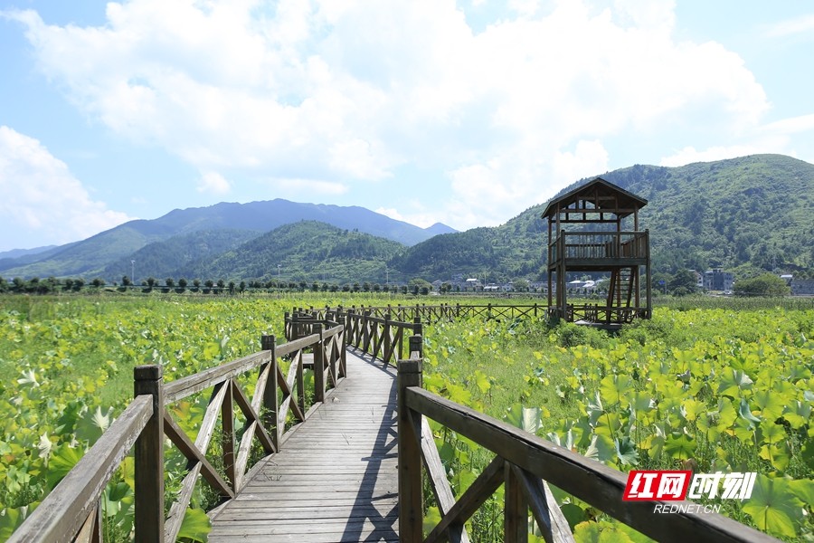 郁郁葱葱的群山与荷塘融于一色,撑一把伞,行走在夏日最美的风景线上。