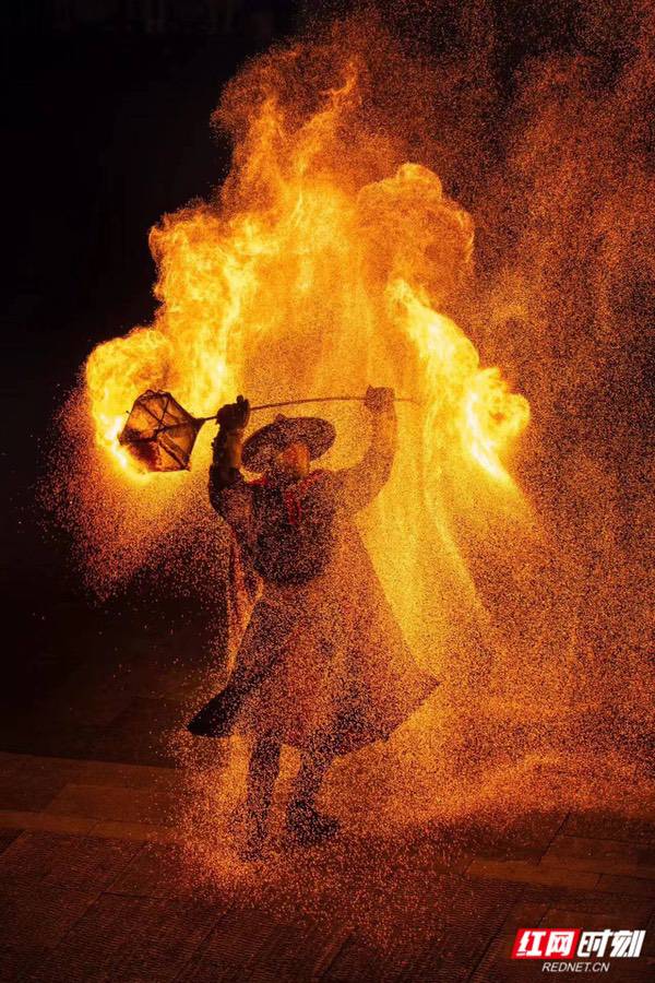 每晚的“宋福燃灯大典”是全场高潮。滚灯舞灵动翻飞,火壶、风火轮惊险刺激,跑酷演员在城墙前腾跃翻飞,点燃全场气氛。紧接着,打铁花腾空而起,滚烫的铁水在夜空中炸开漫天金雨,寓意“越打越发”,游客们纷纷举起手机,惊呼声一浪高过一浪。压轴环节“明灯三千天幕秀”更是科技感拉满。千架无人机以天为幕,变幻出骏马、福字等吉祥图案,最后幻化成漫天星光。