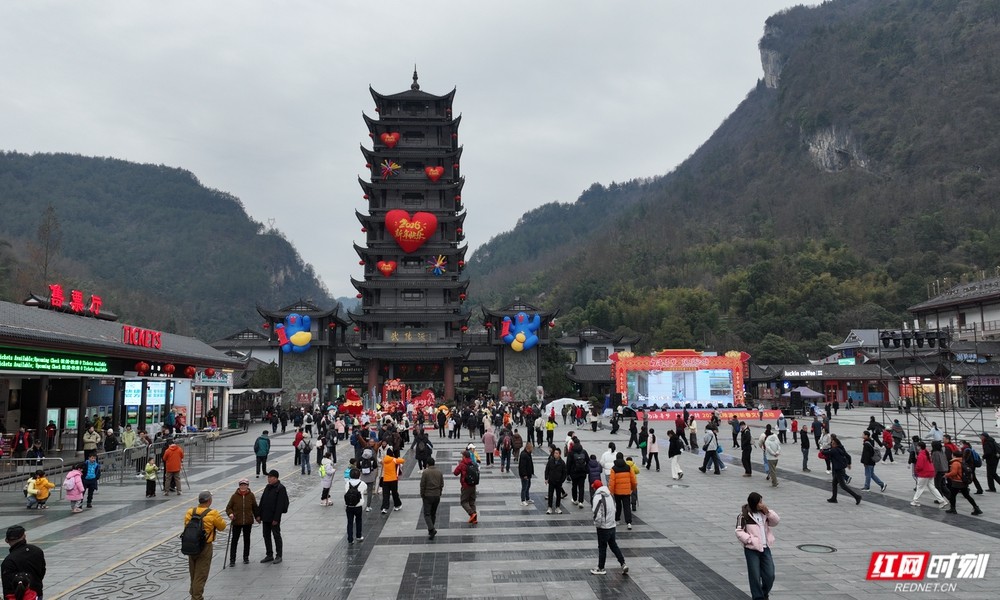 在黄石寨索道、杨家界下站,桑植民歌展演精彩上演,歌手们邀请游客同台合唱,现场掌声不断。百龙天梯中部平台,憨态可掬的互动玩偶穿梭在人群中,和游客握手、合影,送上“马到成功”的新春祝福,让排队等候的时间也变得欢乐起来。