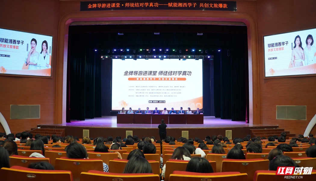 本次活动由湖南省文旅厅导游服务中心、湘西州文化旅游广电局、湘西州广播电视台联合主办,旨在为“大张家界国际旅游区”建设储备复合型导游人才。湘西民族职业技术学院600余名旅游专业学生参与理论学习,8名优秀学子获金牌导游“师徒结对”实战指导。