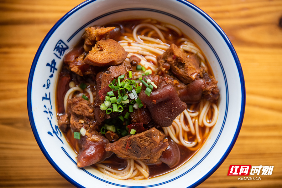 沅陵猪脚粉要选用沅陵当地的米粉才够正宗。米粉以大米为原料,经浸泡、蒸煮、压条等工序制成,质地柔韧,富有弹性。猪脚更是灵魂。精心挑选猪前腿肉,配以几十种中药材熬制,肥而不腻,脆而不硬,汤料经过慢火熬制,既营养又鲜美,秘制猪脚作臊子,配上油泼辣椒、姜、葱、蒜,洒上胡椒粉,鲜香爽滑。浓浓的米香,混合着胶原蛋白的爽滑,光看一眼就让人直咽口水。
