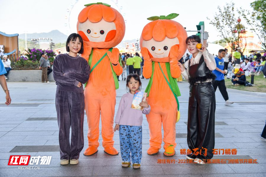 现场观众正在和本届柑橘节的吉祥物“石门橘娃”合影。