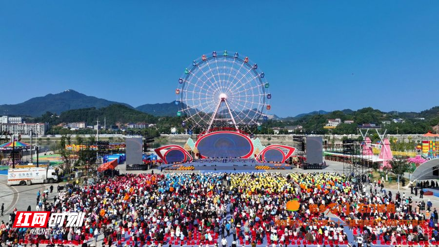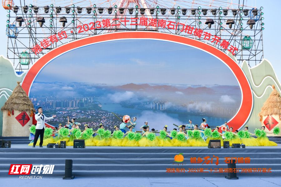 本次节会在澧水河畔的宝峰公园举办,现场人潮涌动,整个舞美以创意场景——“柑橘丰收”为舞台背景。