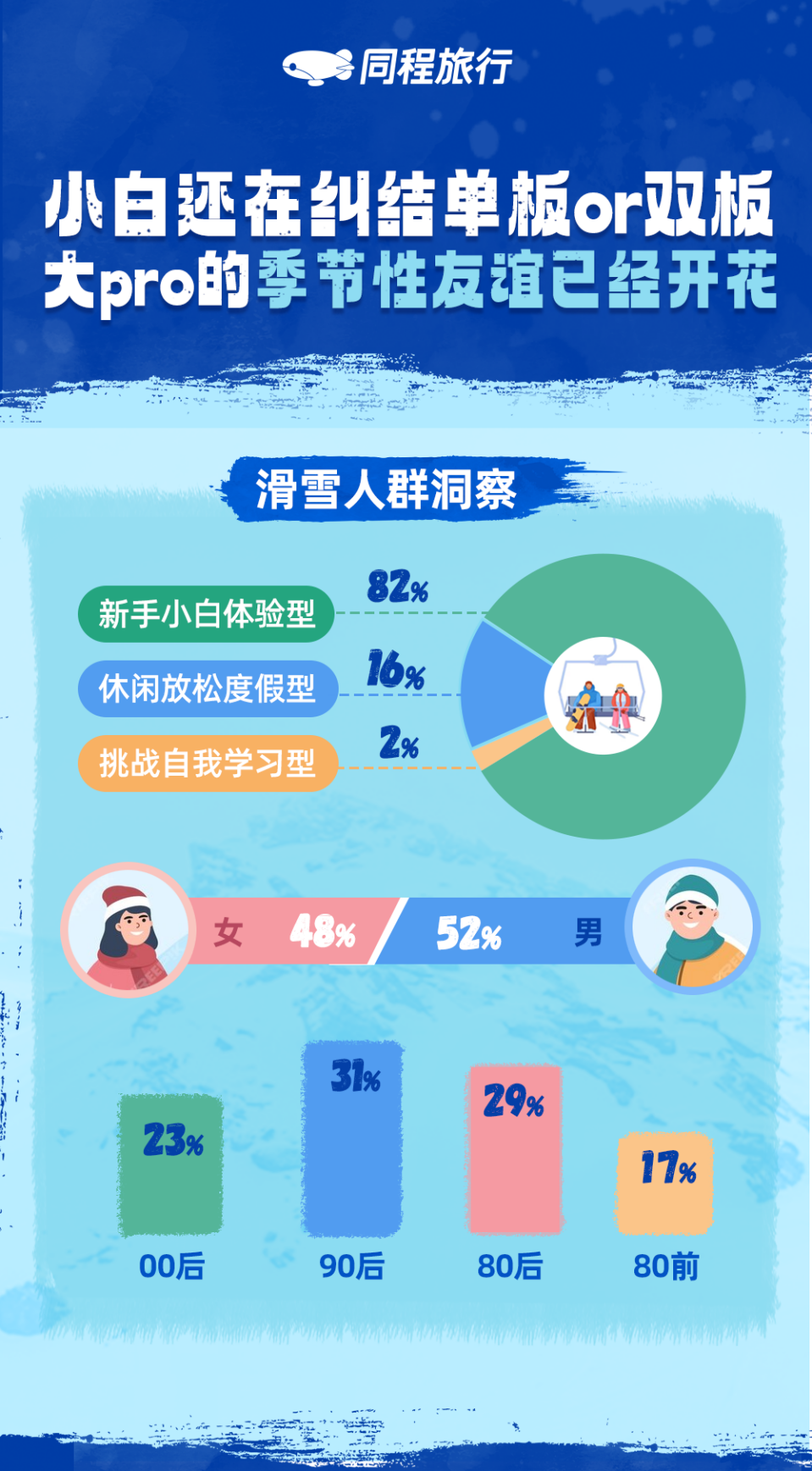 在国民新旅游趋势下,越来越多的游客关注滑雪等体验性更强的旅行方式。滑雪也逐步成为更大众的旅行方式。与此同时,滑雪游客也呈现显著的年轻化特征。