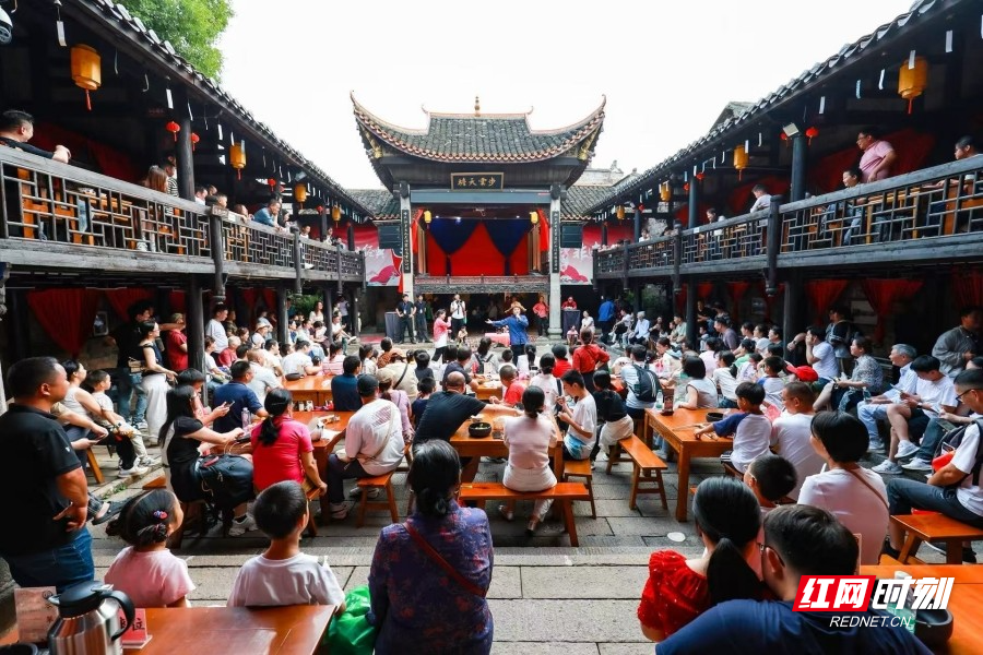 全省各地景区同步推出系列特色活动,营造浓厚节日氛围。靖港古镇举办大学生水上音乐周,“漂浮在湘江上的千年古镇”人头攒动、戏韵满街;岳阳屈子文化园上演七彩祥云水上游船烟花秀,水祭船、画舫与竹筏组成的水上巡游队伍在烟花映照下流光溢彩;怀化市会同县高椅古村则通过竹竿舞、傩戏表演及篝火晚会等互动活动,带领游客沉浸式感受百年古村的民俗魅力。
