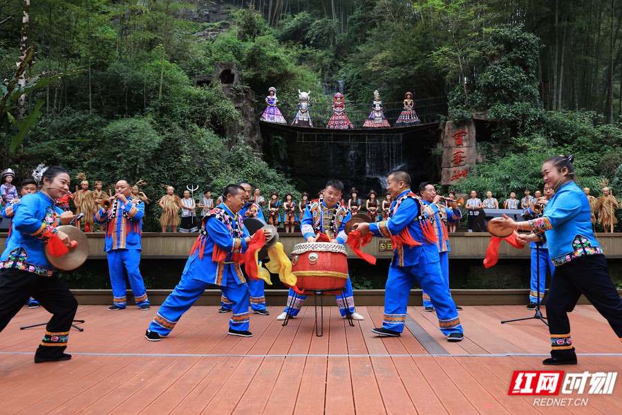 10月3日,在张家界市武陵源区宝峰湖景区,民间艺人展演非遗。吴勇兵/摄