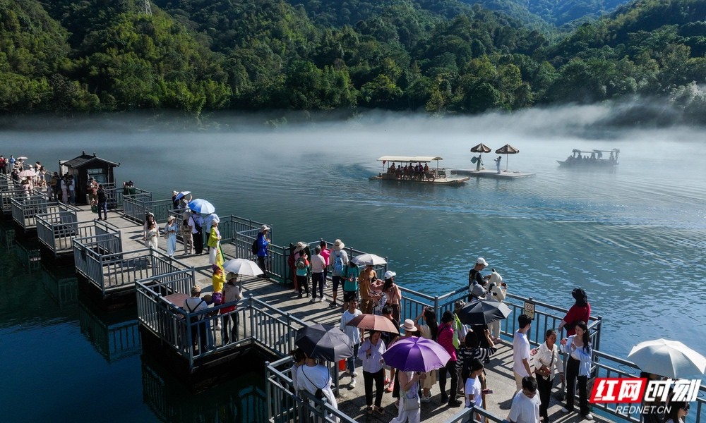 郴州资兴东江湖景区,游客欣赏雾漫小东江。何洪海/摄