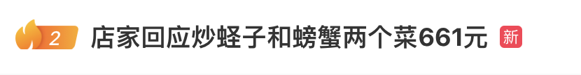 10月7日,“店家回应炒蛏子和螃蟹两个菜661元”相关话题登上热搜。据媒体此前报道,10月6日,有网友在社交平台发文,国庆到广东惠州旅游,在一海边餐厅吃饭时,点了炒蛏子和螃蟹两个菜总价661元,怀疑自己遇到“海鲜刺客”。当事人杨先生称:“原本想着团购,到店里说团购的时间过了,让我们单点,问价格的时候不说,让我们先吃再报价,没想到这么贵。”记者致电餐厅老板得知,顾客点菜时已明确告知价格与斤数,实际收费比标价还低不少。膏蟹标价288元/斤,但进货价约160元/斤,加上人工、租金等经营成本,实际售价为188元/斤。顾客所点的螃蟹重2.4斤,蛏子3斤(单价68元/斤),加上2人茶位费共6元,总计661元。