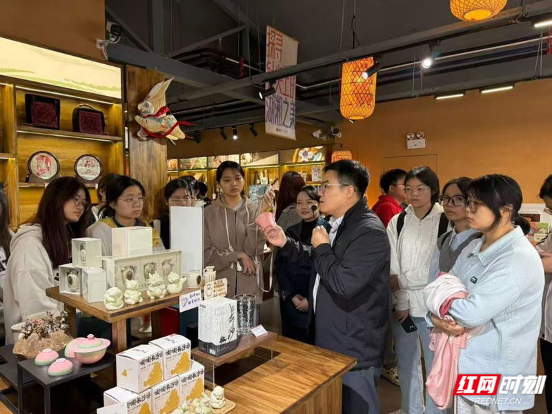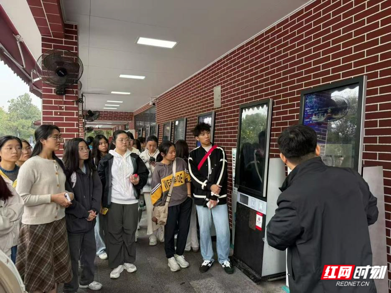 实践过程中,学生依次走访游客服务中心、自助售票处、《恰同学少年》青春剧场、橘市文创店等关键区域,结合橘子洲景区线上预约数据与其他热门景区管理案例,深入理解容量管理的实际应用。在智能售票点,学生现场操作售票设备,体验交通调度对景区人流承载的提升效果;在剧场与文创区,沉浸式表演与特色手工艺品进一步丰富了学生对景区业态的认知。