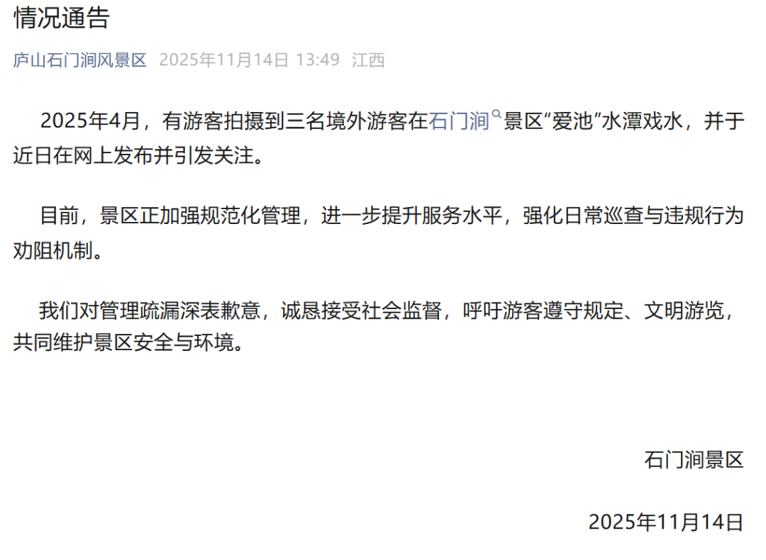 2025年4月,有游客拍摄到三名境外游客在石门涧景区“爱池”水潭戏水,并于近日在网上发布并引发关注。
