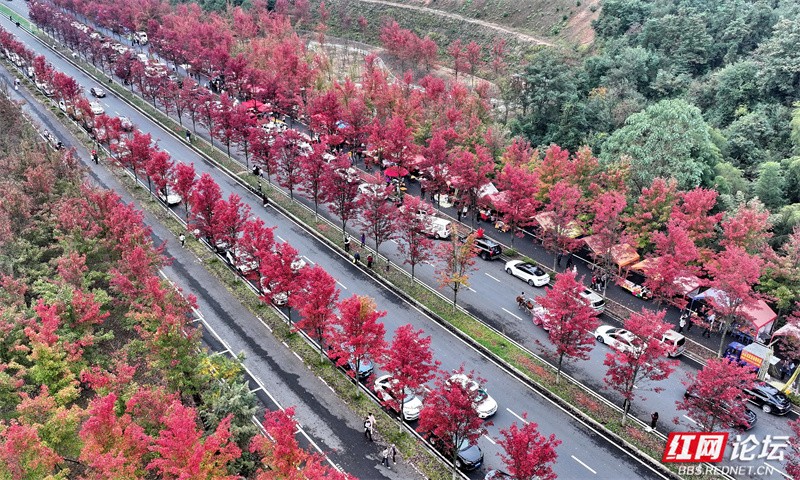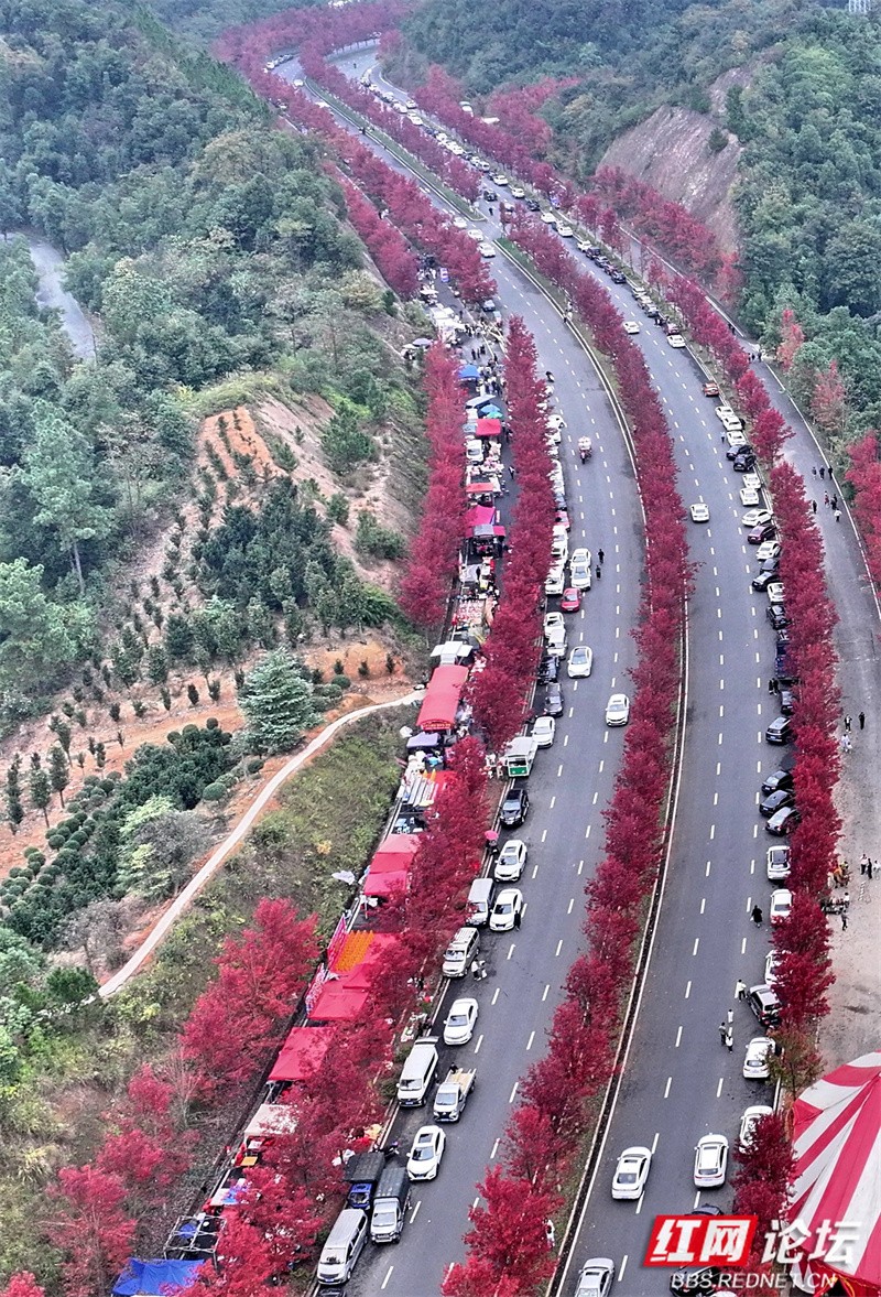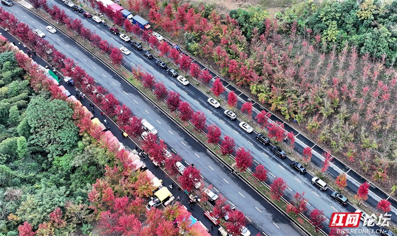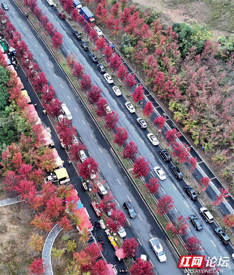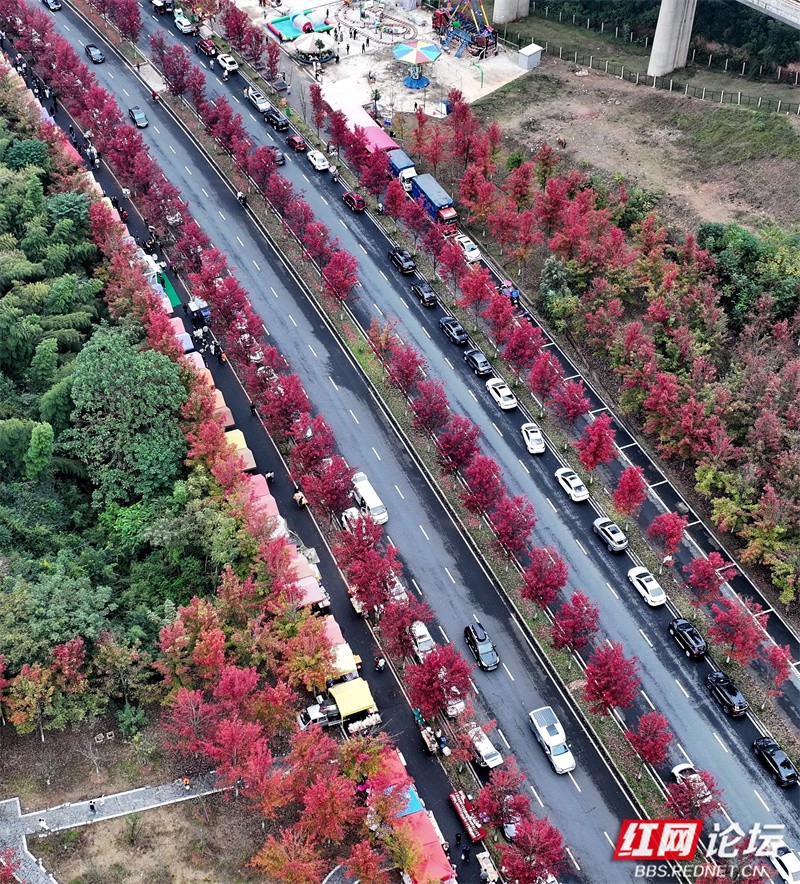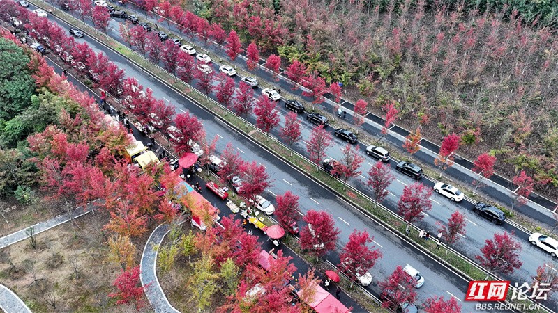 道路上车辆川流不息,路边设有供游客小憩的红色棚摊,不少行人驻足观赏、拍照留念,尽显热闹的赏枫氛围。作为远近闻名的秋季打卡地,红枫大道的最佳观赏期为每年10月下旬至11月中旬,此时枫叶正红,景致如画,美不胜收。(图文/益阳老宁者)